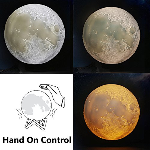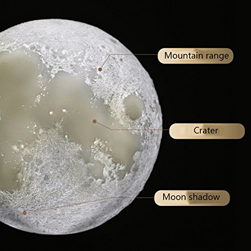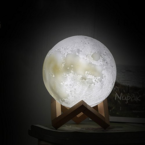 Studio : Aissimio Publisher : Aissimio Binding : Baby Product Product Description Feature: 1.If you love space or have a child that does but is afraid of the dark, then the Moonlight night light would be the perfect addition to your home. 2.This realistic looking night light has been made to look like the moon and has craters and pockmarks along the surface to mimic the moon's surface. 3.As well as this the Moonlight emits a soft white glow that really does look like moonlight (as the name suggests) and will light the area around it up with a soft white light. 4.You can place it anywhere you like. This would be a perfect addition to your child's bedroom night table or in a home office where you simply want a nice relaxing soft light. Specification: 1.Diameter:15cm 2.Style:Moon lamp 3.Cover Color:White 4.Moon Light Color: Yellow,White, Warm white 5.Input voltage: DC3.7V 6.Power: 3.7W 7.Lighting time: about 8 hours 8.Charging time: 2 hours 9.Battery capacity: 500mAh 10.Materials: PVC ABS Package Include: 1 X Moon lamp 1 X Base 1 X USB line 0