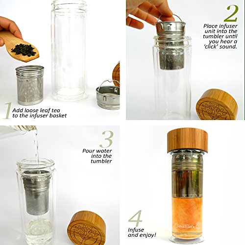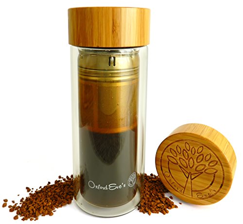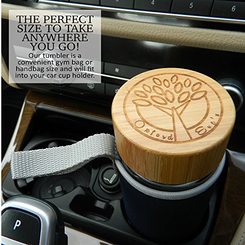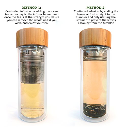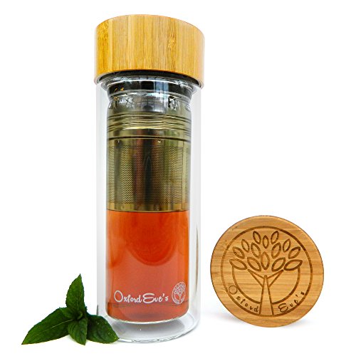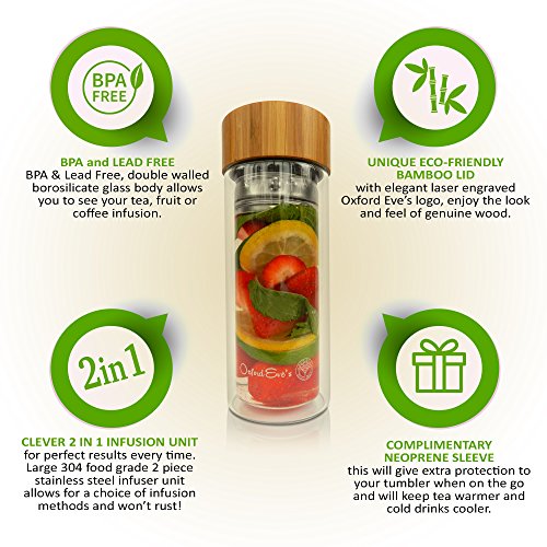 -. Brand : Oxford Eve's -. Color : Clear -. EAN : 0820103116640 -. Feature : BPA and LEAD FREE superior grade double wall borosilicate glass body allows you to see your tea, fruit or coffee infusion. Get the full taste of your drink and have a clean and safe drinking experience! / CLEVER 2 IN 1 INFUSION UNIT for perfect results every time. Large food grade 2 piece stainless steel strainer allows for a choice of infusion methods using loose leaves, tea bags, coffee or fruit pieces! / UNIQUE ECO-FRIENDLY BAMBOO LID with elegant laser engraved Oxford Eve's logo, enjoy the look and feel of genuine wood! The quality silicone inner lining ensures no plastic touches your drink! / COMPLIMENTARY NEOPRENE SLEEVE in our signature navy blue color comes included with your tumbler! This will give extra protection to your tumbler when on the go and keep your tea warmer and drinks cooler! / CUSTOMER SATISFACTION IS OUR #1 PRIORITY! Our customers trust Oxford Eve's to be a high quality premium brand. To emphasize this we provide a 45 day guarantee with each tumbler! BUY YOURS TODAY and receive your exclusive Oxford Eve's INFUSION EBOOK. Buy 2 or more and get an additional 10% DISCOUNT, Perfect as a GIFT! Enter CODE: OXFEVE10 -. PackageQuantity : 1 -. ProductGroup : Kitchen -. ProductTypeName : KITCHEN -. Title : Tea Infuser Glass Tumbler by Oxford Eve's with Bamboo Lid, Quality Stainless Steel Loose Leaf Strainer, and Handy Neoprene Sleeve. Best Infuser for Fruit Infusion, Ice Tea or Green Tea! Replace Your Travel Mug or Water Bottle Today! -. UPC : 820103116640