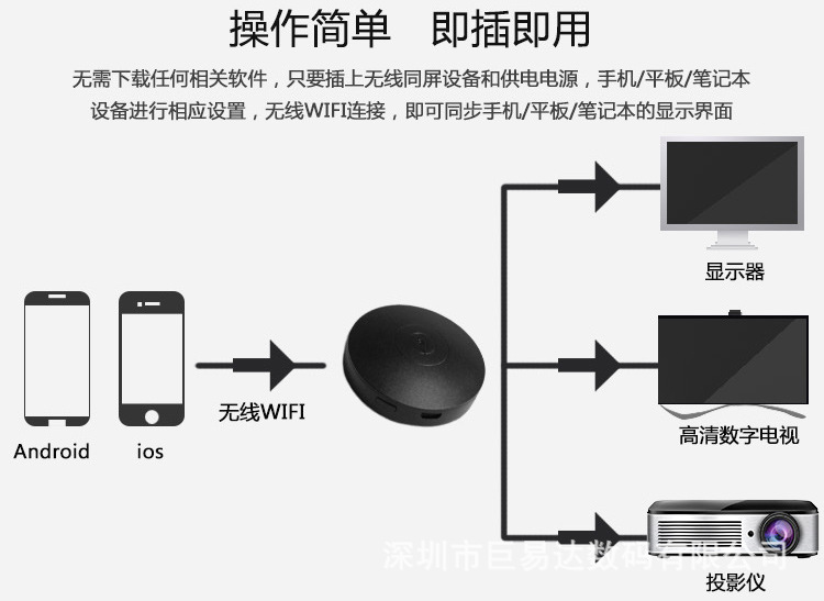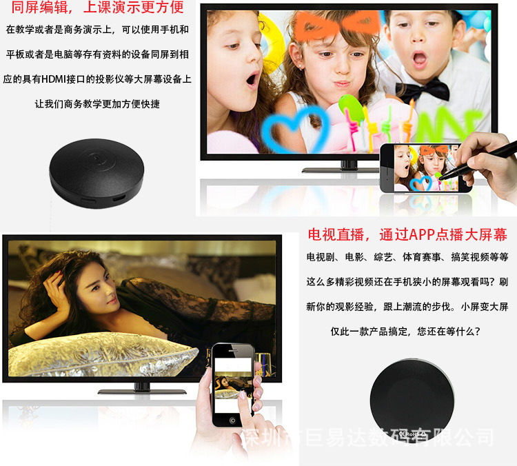 - Support 4 modes- AirMirror / Miracast / DLNA / Airplay to sync cast photo /video / music/office file/web browser / live camera from iPhone/Android Smart phone/tablet PC to large screen TV/ Projector by WiFi, design for PPT presentation and video meeting