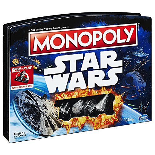 -. Feature : Star Wars-themed Monopoly game / Buy and collect rent from iconic Star Wars locations / Use the Force for special abilities / Features Open and Play Case / Includes gameboard, 2 dice, 4 ship tokens, 64 cardboard property markers (16 for each ship), 16 Chance cards, 1 money pack, and game guide / 2 to 4 players