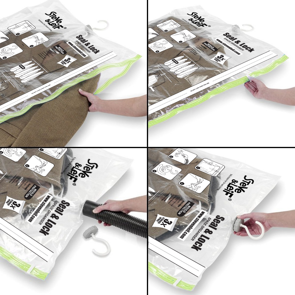 Steve u0026amp; Leif's Seal n Lock Hanger Vacuum Storage Bag is durable and perfect for your storage needs which save up to 75% more closet space! Simply lay flat and vacuum the excess air from the bag and you are ready to go. Keep all your bulky items compressed to make more room in your cabinet!