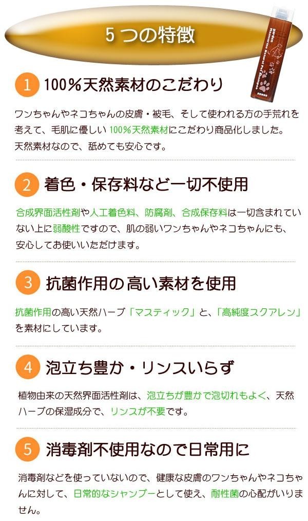 人間の肌よりもデリケートなワンちゃん・ネコちゃんにも安心して使っていただける低刺激・弱酸性のアミノ酸シャンプーです。100%天然由来原料を使用し、合成界面活性剤・人工着色料・防腐剤・合成保存料は一切含まれておりません。天然ハーブエキスとスクワランの保湿成分でリンス不要。アミノ酸マイルド洗浄成分で泡立ちが豊かで泡切れバツグン!!洗いあがりもサッパリ♪ |