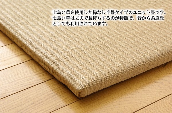 届いたユニット畳を床に置くだけで和のスペースが出来上がります。ヘリの無い、大判の半畳タイプです。表生地には、むかし柔道用の畳にも使用されていた、耐久性の高い中国産の七島イ草を使用しています。また七島イ草は無染土、無着色なので天然素材そのままの美しさがあり、スベスベとした素肌に気持ちの良い感触があります。中材に木製ボードを使用した重量感のある本格タイプです。裏には連結用のテープを貼っていますので、しっかりと畳同士を固定することが出来ます。また木製ボードとイ草生地の間にフェルトを使用していますので、ほのかなクッション性があります。