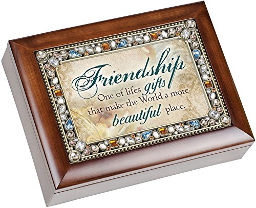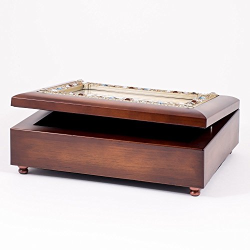 his is a beautiful, heartfelt jewelry box with a rich, dark wood finish and a jeweled lid. It is also a wind up music box with a high quality Sankyo music mechanism. The lid doubles as a 4x6 photo frame so you can put in a personal picture. It features cushioned feet so it doesn't scratch surfaces. It has a velvet lined inside. The music mechanism can be seen playing through glass on the inside of the box. This is a great quality item that will make many memories for years.Feature
