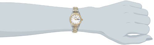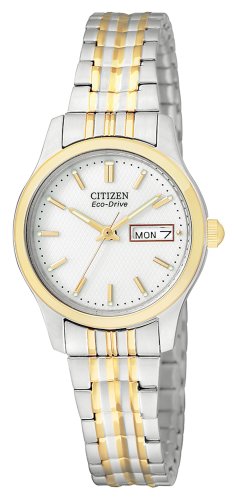 - Feature : Stainless steel watch with gold-tone striping and day/date window / Eco-drive technology is fueled by light and never needs a battery / Japanese quartz movement with analog display / Features three-link expansion band and protective mineral crystal display window / Water resistant to 99 feet (30 M): withstands rain and splashes of water, but not showering or submersion