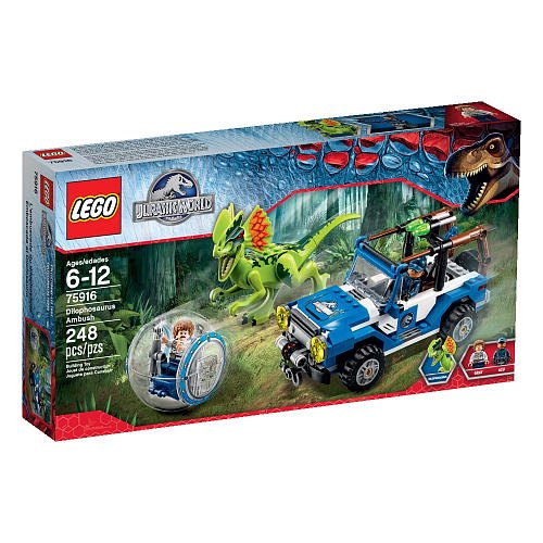 -. Binding : Toy -. Brand : LEGO -. Color : Multicolor -. EAN : 5691702290148 -. Feature : Danger! Gray has got lost in the park and is rolling around in a gyrosphere being chased by a dilophosaurus. Join the ACU trooper as he drives to the rescue in the classic Jurassic World 4x4. / Includes 2 minifigures with a weapon and assorted accessories: Gray and an ACU trooper / Jurassic World 4x4 features driver's cockpit, rubber tires, front winch, rear explode function, boxes and Jurassic World decoration -. IsAdultProduct : 0 -. ItemPartNumber : 6103343 -. Label : LE GO -. Manufacturer : LE GO -. MPN : 6103343 -. PartNumber : 6103343 -. ProductGroup : Toy -. ProductTypeName : TOYS_AND_GAMES -. Publisher : LE GO -. Size : 13.9 x 7.5 x 2.3 -. Studio : LE GO -. Title : Jurassic World Dilophosaurus Ambush Play Set (75916)