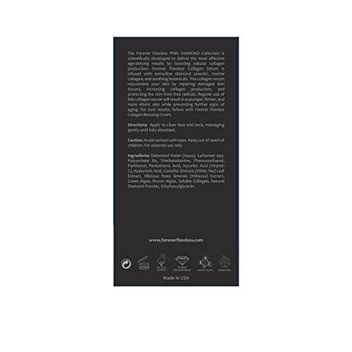 -. Feature : Forever Flawless PINK DIAMOND Collection is scientifically developed to deliver the most advanced age-defying results in the luxury skin care market by BOOSTING NATURAL COLLAGEN PRODUCTION. / Forever Flawless Collagen Serum is infused with extra-fine DIAMOND POWDER, MARINE COLLAGEN, and soothing botanicals. / Forever Flawless Collagen Serum rejuvenates your skin by repairing damaged skin tissues, increasing collagen production, and protecting the skin from free radicals. / Regular use of this collagen serum will result in a younger, firmer, and more elastic skin while preventing further signs of aging. For best results, follow with Forever Flawless Collagen Boosting Cream.
