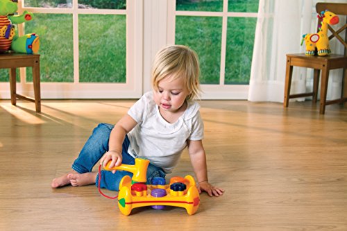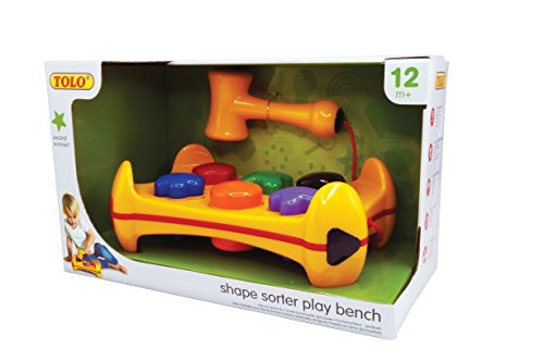 Give Toddlers the benefit of 2 classic developmental toys with this great plastic bench. It combines shape and color matching with a pounding toy to improve motor skills, and hand-eye coordination. Children insert the 6 colorful shape blocks into the matching cutouts and bang them home with the attached hammer, for loads of energetic fun. Tolo Toys award winning designs, bright colors and cute characters make growing up fun. Specially designed to stimulate a child's interest and curiosity, these toys encourage important developmental skills, while upholding high standards of safety and durability.Feature