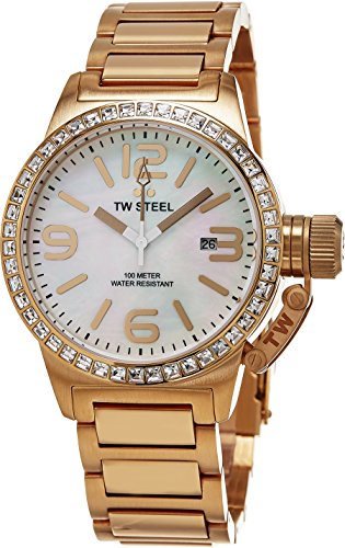 Brushed PVD plated rose gold stainless steel case (40 mm in diameter, 13 mm thick), Screw-down case-back with embossed TW Steel logo, Bezel set with 46 Swarovski crystals, Mother-of-pearl dial with TW Steel logo at the 12 o'clock position, Rose gold hands, indices and Arabic numerals, Date window at the 3 o'clock position, Reinforced mineral crystal, Screw-down crown cap, Quartz movement, Miyota caliber 2115, Water resistant to 10 ATM/100 meters/330 feet, Brushed and polished PVD plated rose gold stainless steel bracelet, Push button deployment clasp with safety, Model number: TW306.