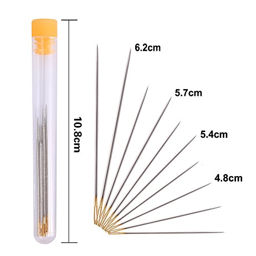 - SEWING NEEDLES - Large-eye needles are in 4 sizes (6.2cm, 5.7cm, 5.4cm,4.8cm), 2 pieces for each size, they are packed in a clear plastic bottle, which is easy to store and carry. Wood handle awl can be used on pinpointing punching holes in paper or fabric.