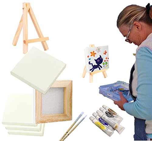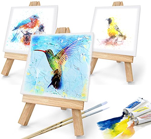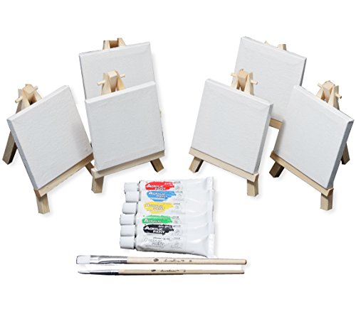 - VERSATILE PACK: The 6 piece superior pack of 6 mini 3”x3” 3-ply / 9.88-oz stretched canvas with triple primed gesso and 6 hand-finished 5” solid wood easels manufactured from ethically sustainable wood comes complete with 6 non-toxic water-based acrylic paints and 2 short-handle nylon paint brushes with flat and round heads for all media. It offers the beginner, student or professional artist premium quality at an affordable price.