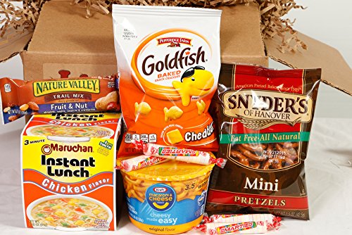 -. Feature : A great way to brighten your College Students day! / A brilliantly collaborated mix of snack food, sure to satisfy any Students grumbling tummy. / Keep your Student stocked up even if they are far from home. / 100% Satisfaction Guaranteed, / Send them a messgae! (done through the checkout process).