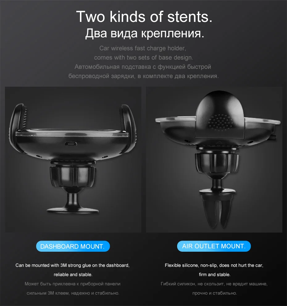bases (vent clip and console support), Qi standard supported