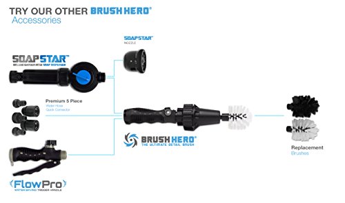 An amazing auto-detailing tool, the Brush-Hero offers much more making ALL cleaning projects easy and fun. This innovative water-powered turbine combines the advantages of scrubbing power tools with the simple cleaning power of water. Use with car soap, cleaners or water alone. You'll find the Brush-Hero handy for tires, rims and all auto detailing needs. Use the white brush for tough jobs and the black brush for sensitive surfaces such as chrome. It really works! Even use it as a hand cleaner after messy, muddy yard work or greasy auto and bike repair.