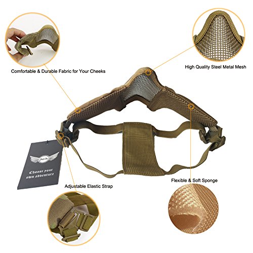 -. Binding : Misc. -. Brand : AegisTac -. Feature : Fully adjustable. The side strap with adjust belt ensure the fit. Can easily be formed to fit most faces / Combo with a full sealed eye goggle (Not Included) to achieve full face protection required by fields / Superb air ventilation prevents fatigue, fogging, and sweat from building up / Superb protection provided by steel wire high gauge wire mesh. / Does not muffle your voice, allowing you to be heard clearly by your teammates -. IsAutographed : 0 -. IsMemorabilia : 0 -. Label : AegisTac -. Manufacturer : AegisTac -. MPN : AT-MZ03 -. PartNumber : AT-MZ03 -. ProductGroup : Sports -. ProductTypeName : SPORTING_GOODS -. Publisher : AegisTac -. Studio : AegisTac -. Title : AegisTac Half Face Lower Mask Foldable Mesh Adjustable Tactical Metal Steel Mask for Airsoft