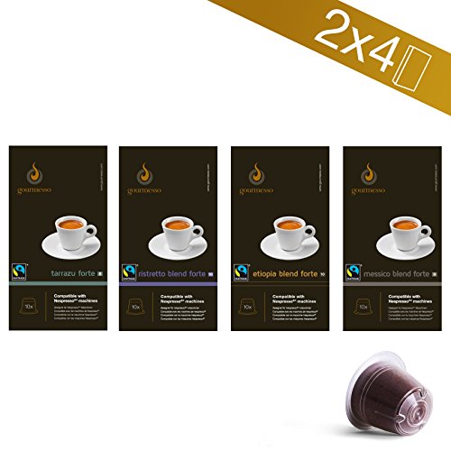 Our Mini Forte Bundle includes 2 boxes each of our Etiopia Blend Forte, Ristretto Blend Forte, Messico Blend Forte and Tarrazu Forte. These espresso capsules, with intensities ranging from 8-10, are distinguished by their intense flavor and exceptional taste. You get the same rich experience you would with any Nespresso(r)* capsules.The pods are compatible with Nespresso(r) OriginalLine machines including the Inissia, Pixie, CitiZ, Maestria, Lattissima, KitchenAid and others. You will receive 80 Nespresso(r) compatible pods when you order our Mini Forte Bundle of Nespresso(r)* compatible coffee capsules from Gourmesso. Buying Gourmesso coffee capsules will save you over 30% compared to Nespresso(r). Not compatible with Nespresso(r) VertuoLine machines.Feature