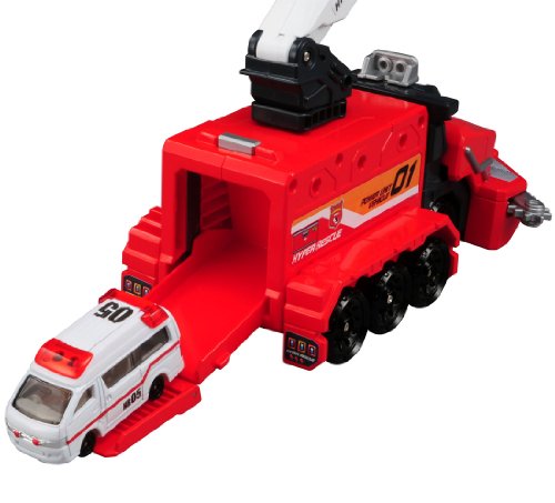 レスキュー0(ゼロ)(別売)をフォームチェンジ可能な特殊ビークルです。合体するとレスキュー活動フォームの「レスキュー01」へフォームチェンジします。コンテナ部にはトミカ1台格納可能、ボタンを押すとスプリング発車します。プラキッズ乗車可能。