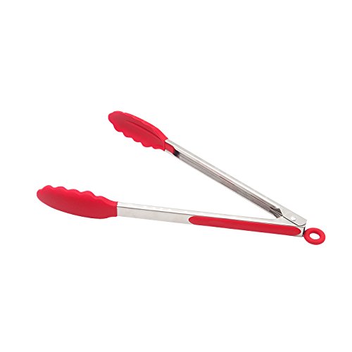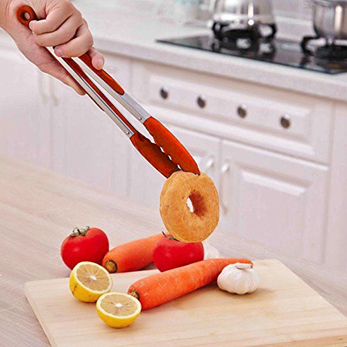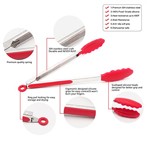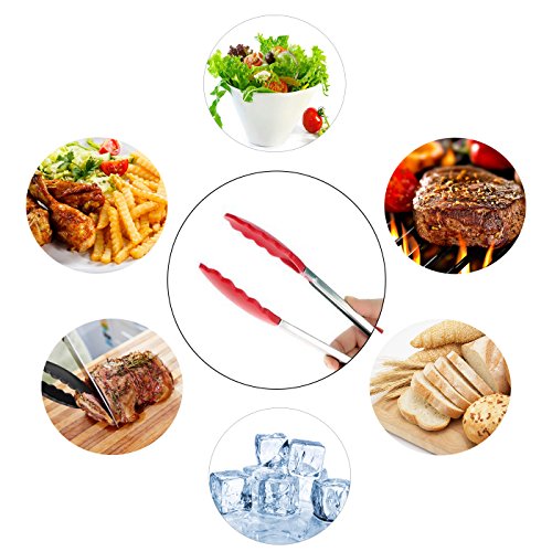 - ★INGENIOUS DESIGN. Kitchen tongs have metal grippers covered by a non-removable silicone cover, which is excellent and makes the food tongs easy to grip food while cooking. Heat resistance non-slicks rubber can take up to 480℉so you don’t have to worry about scraping pans.
