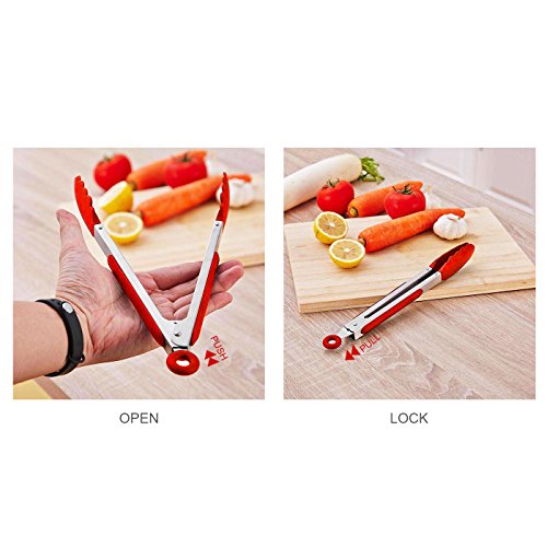 - ★EASY TO USE AND Machine Washable Kitchen tongs have a pull-ring at the top to keep them closed when not in use, it makes storage really easy and it’s also portable enough to take out for outdoor cooking or barbeque. Sturdy stainless steel with premium heat resistant, no-stick silicone tips is easy to clean and just clean under hot water or throw them into dishwasher.