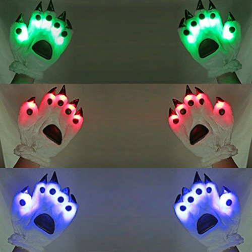 Feature: As for color settings and patterns of Luwint LED Bear Paw Gloves, when you first press the button on the wrist, there is red, blue and green three colors flashing together. The second time you press the button, it will be those three colors transition. The third time, it is the three solid color. It will become single red, blue, and green color flashing when you press the button the fourth, fifth, and sixth times. This premium and individualization bear paw gloves can bring you the whole night active atmosphere and high passion. Although this is adult size, imagine that if your kids little hands wear the big lighting gloves, it may be more cool and awesome!
