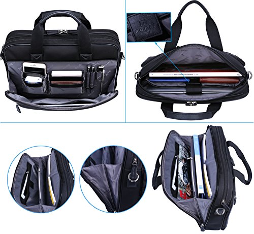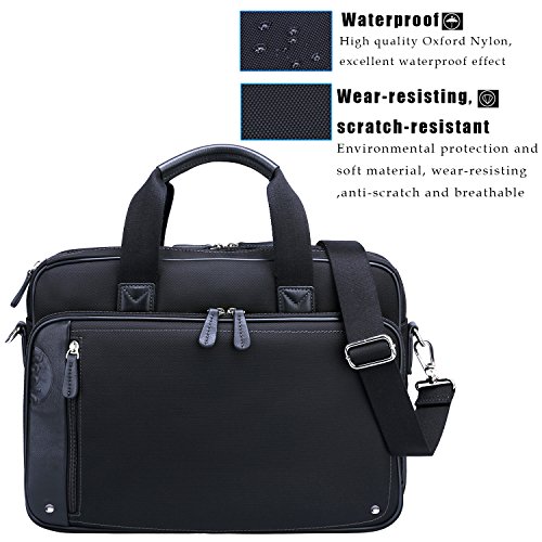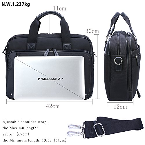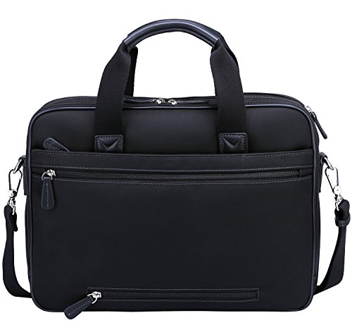 Product Description It is a business briefcase which is enough durable for your daily belongings.The bag is made of waterproof crease resistant nylon and leather. It can hold laptop,iPad,notebooks,pens,keys,wallet,cell phone,etc. Main feature: Top with double handle 2 compartments suitable for 14" laptop Multi-function and large capacity storage for your stuff Detachable and adjustable shoulder strap Material: Waterproof crease resistant nylon and leather Cotton polyester Size: 15.35 x 4.72 x12.2 inch 39 x 12 x 31 cm Net Weight: 1.13kg Color: Black Exterior: 2 x Front zip pocket 1 x rear zip pocket 1 x rear double zip slot fixed suitcase Interior: 1st compartment 1 x 14" laptop pocket(Fits to HP 14"/Lenovo 14"/Macbook pr 2 x open pockets 2nd compartment 2 x zip pockets 2 x open pockets 0