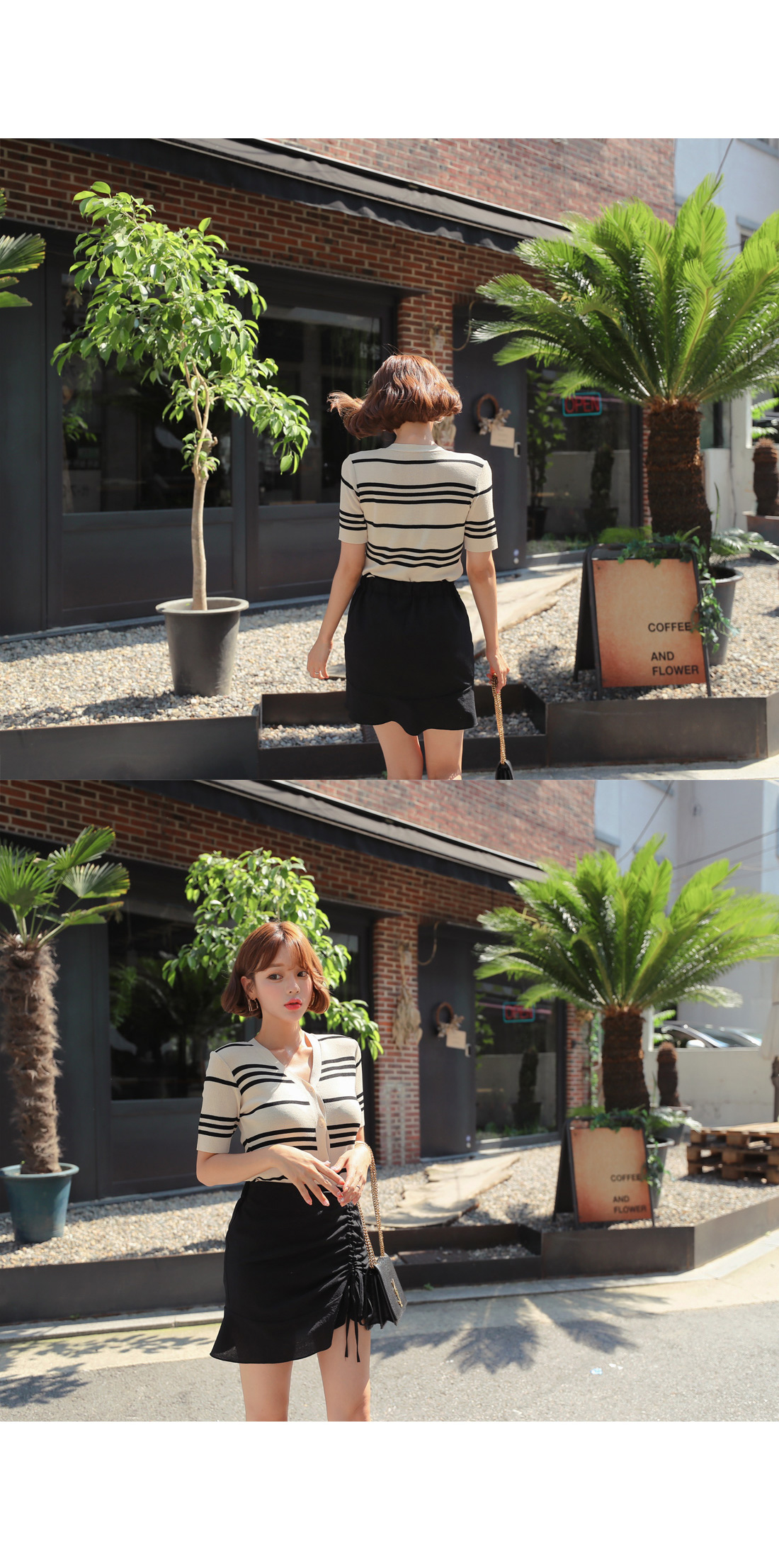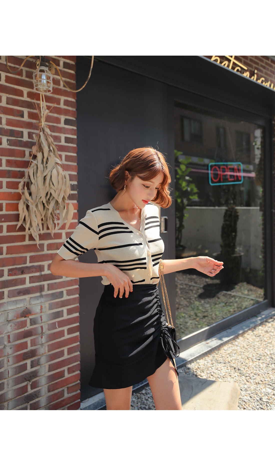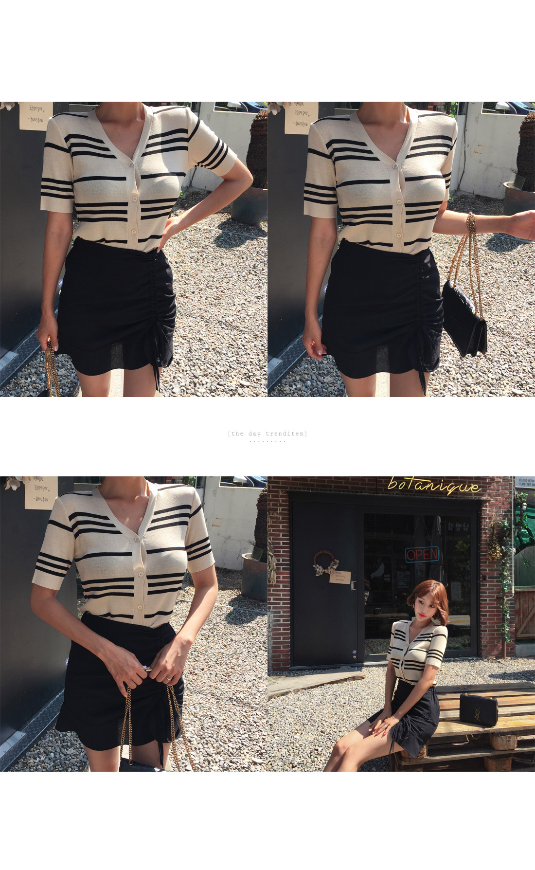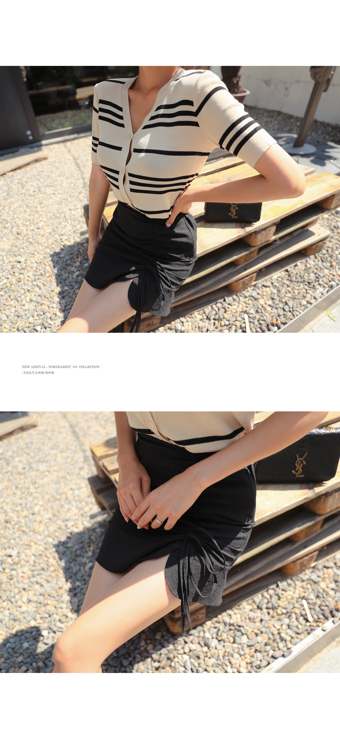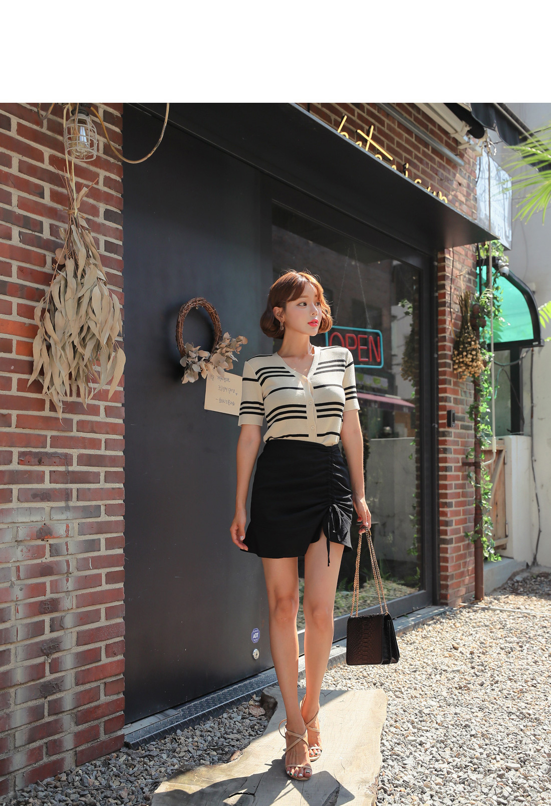 셔링 디테일이 트렌디하면서 멋스러운 룩을 완성시켜주었고