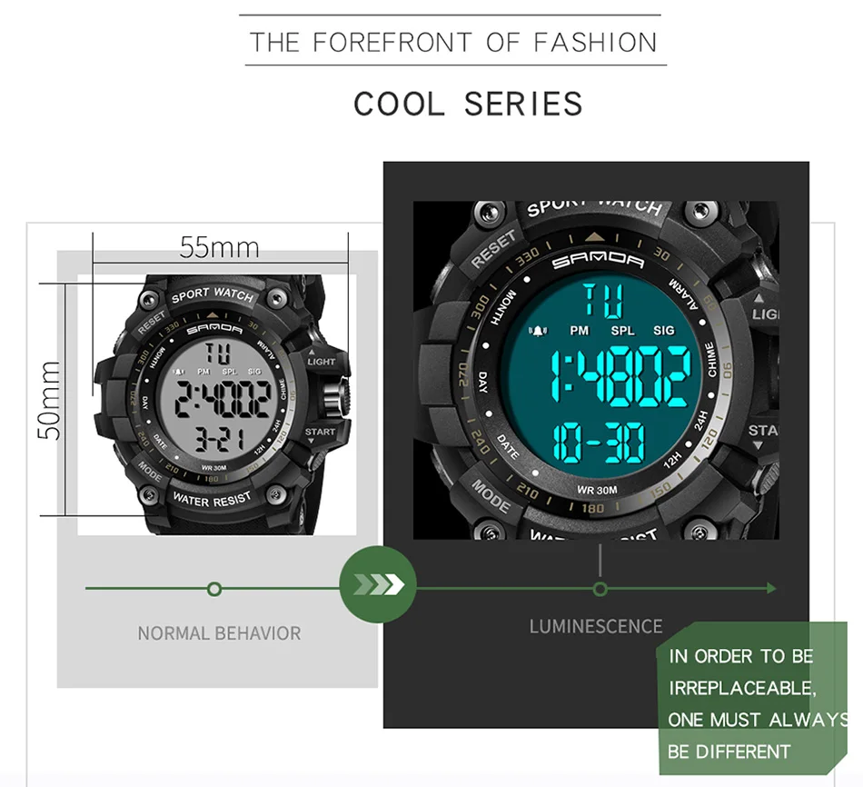 Feature:Water Resistant,LED display,Luminous,Multiple Time Zone,Stop Watch,Back Light,Complete Calendar,Shock Resistant,Diver,Chronograph,Auto Date,Alarm,Swim
