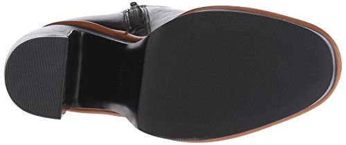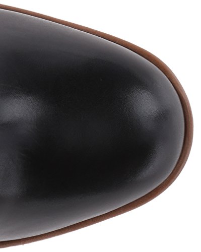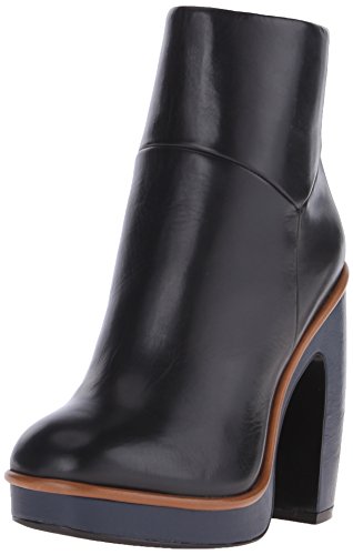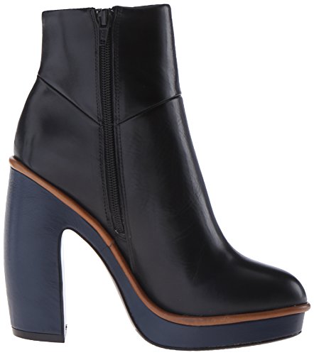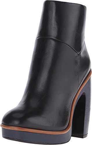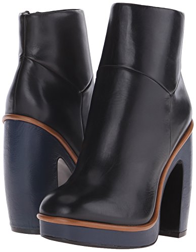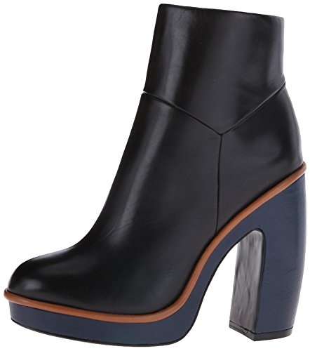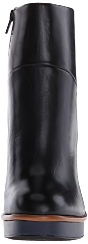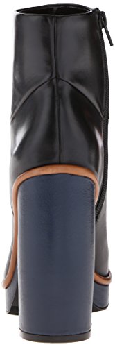 Leather ankle boot featuring black upper, tan midsole stripe, and navy platform heel