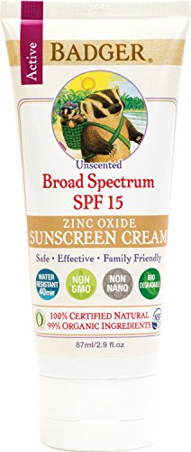 -. Binding : Health and Beauty -. Brand : BADGER -. Color : n/a -. Department : 23 Sun and Outdoor -. EAN : 0634084460339 -. Feature : Easier to apply and less whitening than higher SPF zinc oxide sunscreens. / Works great when you don't need maximum protection! / Broad spectrum protection from UVA & UVB rays using the safe mineral Zinc Oxide - No oxybenzone, octinoxate, or other chemical active sunscreening agents. / Water Resistant for 40 minutes; biodegradable. / Certified Organic base of Sunflower Oil, Beeswax, and Vitamin E is ultra-moisturizing and soothing. -. IsAdultProduct : 0 -. IsAutographed : 0 -. Label : Badger Balm -. LegalDisclaimer : NA -. Manufacturer : Badger Balm -. Model : WSB46033 -. MPN : XA-074 -. NumberOfItems : 1 -. PackageQuantity : 1 -. PartNumber : XA-074 -. ProductGroup : Beauty -. ProductTypeName : BEAUTY -. PublicationDate : 2015-11-23 -. Publisher : Badger Balm -. ReleaseDate : 2015-11-01 -. Size : N/A -. Studio : Badger Balm -. Title : Badger SPF 15 Unscented Sunscreen - 2.9 fl oz Tube -. UPC : 634084460339