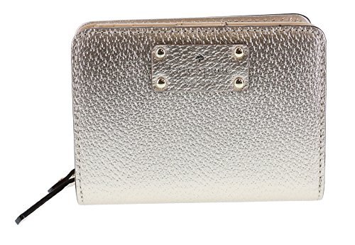 Wrapped in Rosegold textured leather with gold tone hardware. This Kate Spade zip around/snap small wallet is accented with the Kate Spade name plate on the front and features a full length slip pocket on the back. Top stitch detailing throughout. The interior is tan leather with coordinating cream and tan fabric. It features a zippered compartment, card slots and a ID window. Overall measurements of approximately 4" (L) x 3" (H) x 1.5" (W).