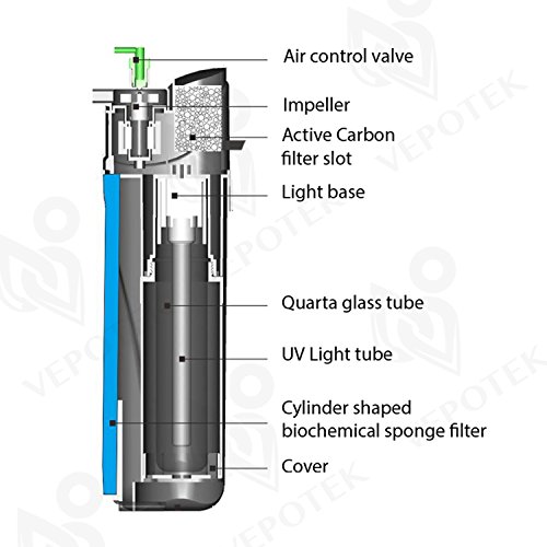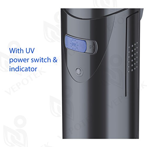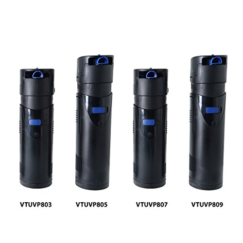 Vepotek UVP Series Submersible UV sterilizer pump is designed for between 40 gallons to 200 Gallons tank. With its max flow rate up to 200 gallons/hour and special designed filtration system (Both active carbon & Bio Chem foam filter) to provide the maximum filtration capacity along with a UV light which can be turn on or off separately from the pump.Feature