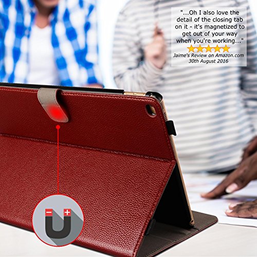 Attention to Detail - The magnetic closing flap sticks to the back of the case when in use, no more annoying ‘flapping about’ in front of your screen. You’ll find a hand-strap inside so you can now hold your iPad securely with only one hand. Smart Auto Sleep/Wake give you one less thing to do, and one less button to press. Never again forget to lock your iPad; your case will do it for you! Saves battery power and there’s no need to charge as often.