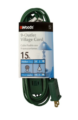 Woods 2189 9-Outlet Indoor Extension Cord, Christmas or Holiday Lights, 15-Foot, Green