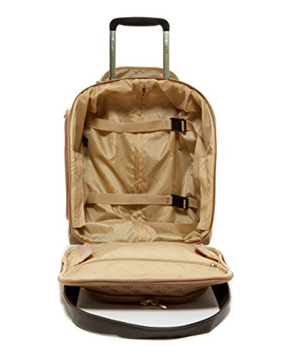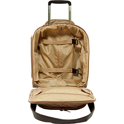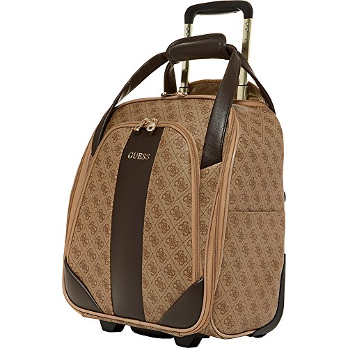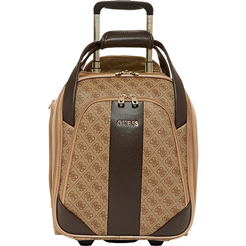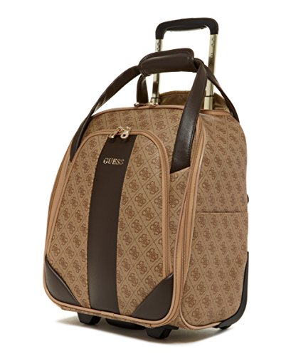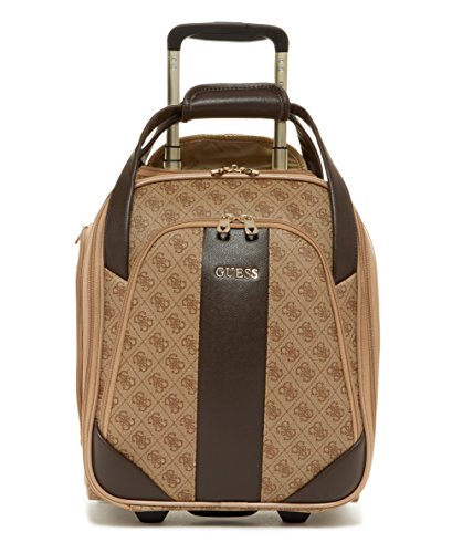 Studio : Guess Luggage Publisher : Guess Luggage Binding : Apparel Product Description GUESS Fashion Travel - Nissana Collection Wheeled Under seater. Features of this brown bag with gold hardware include light weight body construction, multi stop aluminum trolley system, top carry handle, interior organization, GUESS jewelry-crafted hardware, fully lined with GUESS logo pattern, GUESS ID Tag, and jewelry inspired zip pullers. For most airlines this bag is undersea and overhead compatible, Designed in Los Angeles, 5-year limited warranty. 0