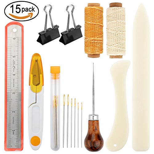 - Package Content: 6 pieces large needles with a clear bottle, 2 pieces bone folder creaser, 2 pieces waxed thread, 2 pieces binder clips, 1 piece stainless steel ruler, 1 piece scissors, 1 piece wood