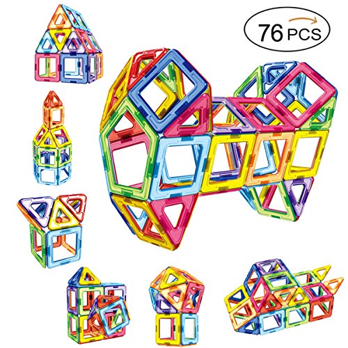-. Feature : Play and fun: fits for all age kids, a best way for them to explore the world of geometry and architecture. Kids can can follow the idea booklet or create their own wanted models,such as goat, house, pentagram, heart shape, ball, etc,. / Develop skills: our magnetic building blocks unleash creativity & ingenuity by helping toddlers and kids develop imagination, recognize shape & colors, thinking & problem-solving ability, building & design ability by developing while your child is busy playing. / Compatible with brand blocks: compatible with most of brand similar-size tiles,such as magformers,picassotiles,quadpro,magnetic,camkey,7tech,playmags, newisland, playbees. / Safe and durable: round edge design protects your kid's little hands; ultrasonic welding prevents the fell-out of the magnet from the plastic; all rainbow color pieces have been tested through hydrochloric acid , make it safe to diy for child with smooth hand-feeling. / Package content: 76 pieces building set and a storage box, includes 26 squares, 50 triangles. Convenient to carry and store with our storage box. With one year warranty and 30-day money back guarantee hassle free.