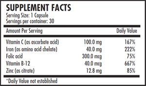 -. Feature : Iron (Amino Acid Chelate) and vitamin B-12 compound for gastric bypass anemia support. / Contains vitamin C, folic acid, and zinc for maximum bioavailibility and absorption. / Facilitates the transportation of nutritional minerals across the intestinal wall as a part of digestion. / Helps regenerating hemoglobin and healthy red blood cells. / Free of common allergens, sugars, unnecessary binders and fillers, and artificial colors and flavors.