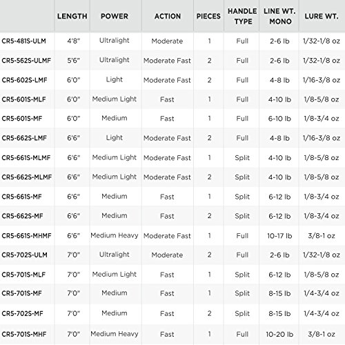 A ROD FOR EVERY OCCASION: Premium materials, along with its availability in many configurations, make the CR5 a great spinning rod to have on hand - ideal for gamefish including freshwater fish like bass, walleye and trout as well as popular inshore species like redfish, speckled trout and flounder with a rinse after fishing. The CR5 series of spinning rods will exceed your expectations with features, quality, and design you have come to appreciate in spinning rods costing almost twice as much.
