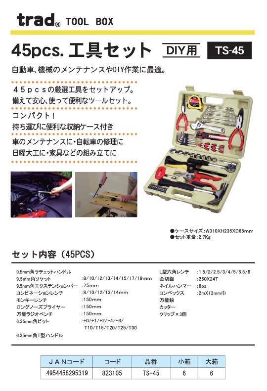 【商品名】(業務用3個セット) TRAD 工具セット/ツールセット 【45種類入り】 収納ケース付き TS-45 〔DIY用品/日曜大工〕