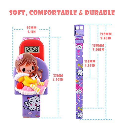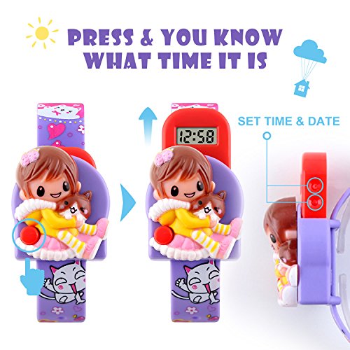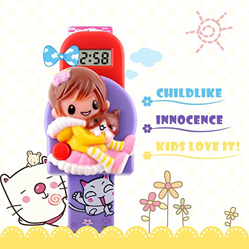 -. Feature : Cutest girls' digital watch ever! Your little angel adores it! With a little girl holing a lovely cat in her arms on the irregular dial and cute cartoons on the watch band, it is a perfect first watch for your angel. / Precise time keeping. Imported Japanese battery provides the watch strong power. Time is super easy to read with clear digital dial. / Detachable dial, comfortable and durable PVC watch band makes it more flexible. Assemble or disassemble it as you like. The robot-shaped dial is easy to operate and the watch itself is a TOY. / 1 button to pop up the dial. Press the button (Red on lower left) on the watch, the watch dial automatically pops up and you can see the time and date. It helps to tell time and make its wearer look good while doing so! / Invaginated side buttons design. No exposed buttons for your kids to push by mistakes. Acting as a watch and a toy, you will never regret for getting one for your girls! What is in the package: Girls Digital Watch x 1