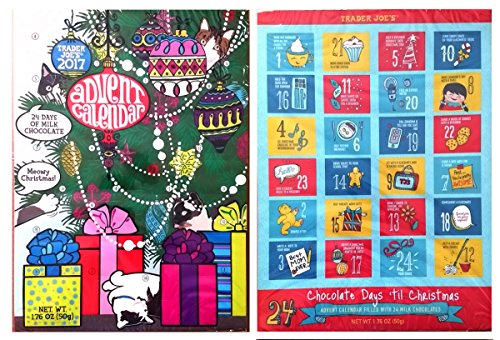-. Feature : Pack of 2 assorted 2017 Trader Joe's Milk Chocolate Advent Calendars / 2 - Advent calendars filled with 24 milk chocolates each to count down till Christmas! / Non-GMO and free of artificial colors / Contains milk and soy