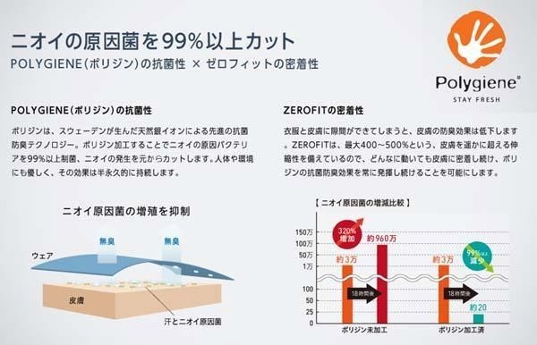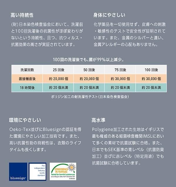 | 天然繊維である「和紙」を取り入れることで、活性炭のような構造である繊維の空洞にニオイのもとを吸着します。更に、天然銀イオン抗菌抗ウイルステクノロジー「POLYGIENE(ポリジン)」を採用!!毎日のビジネスライフに気持ちよさをプラスします。 |