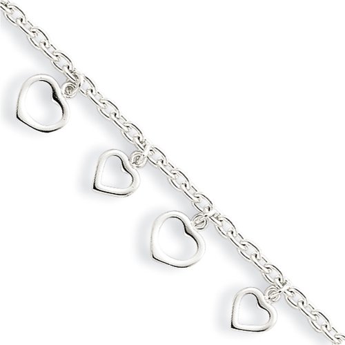 Piece together the ideal summer ensemble with our open-heart dangling charm anklet created from polished sterling silver. It features a 2.5mm cable chain that is 9 inches in length and finish with a fancy lobster clasp. The heart charms are approximately 7 and 8mm in width.Feature