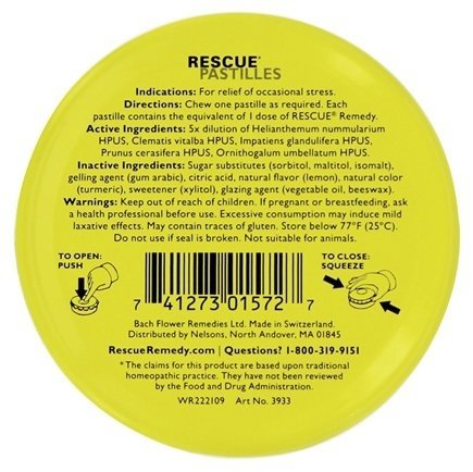 ReleaseDate : 2014-04-11 Studio : Nelsons Publisher : Nelsons Binding : Health and Beauty Product Description Bach Original Flower Remedies Rescue Remedy Pastilles Lemon are tasty candy specially formulated using the Original Bach Flower Remedy formula for use by the whole family, including children. Bach Original Flower Remedies Rescue Remedy Pastilles Lemon are ideal for coping with exam stress, driving tests, first day of school nerves, job interviews and high pressure environments. The funky tin with an easy "press on the lid" opening and closing mechanism. It is easy to take anywhere and with natural flavoring safe for use by the whole family. Natural Color. Natural Flavor. Non habit forming. Sugar Free. Alcohol Free. Dr. Bach formulated Rescue Remedy nearly a hundred years ago, yet never before has it been more relevant with millions of people relying on Rescue Remedy throughout the world to get themselves through the complications and shocks of life 0
