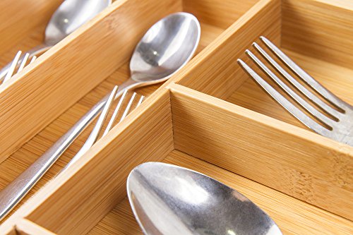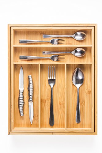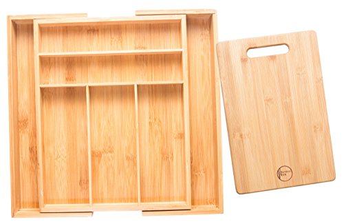 ✪ BONUS: FREE BAMBOO CUTTING BOARD FOR YOUR KITCHEN: The extendable silverware tray expands from 5 compartments to 7! The utensil tray is expandable to fit even your widest drawers for optimal organization. The small bamboo cutting board is not only eco friendly, but the perfect cutting board size!