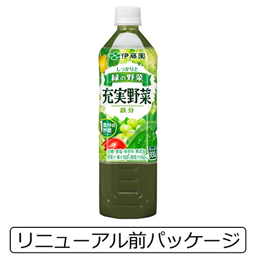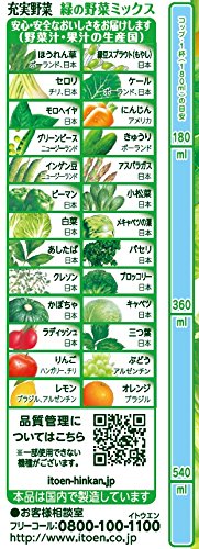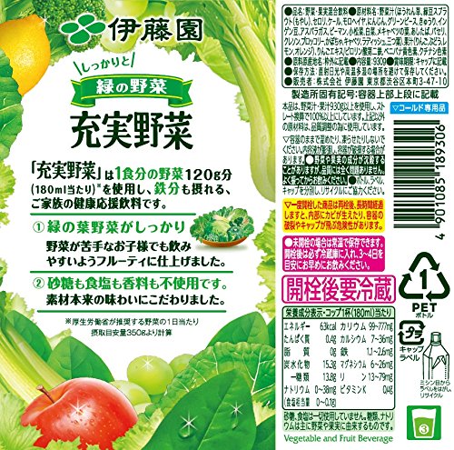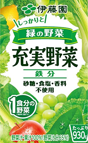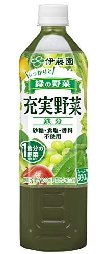 原材料:野菜汁(ほうれん草、緑豆スプラウト(もやし)、セロリ、ケール、モロヘイヤ、にんじん、グリーンピース、きゅうり、インゲン豆、アスパラガス、ピーマン、小松菜、白菜、メキャベツの葉、あしたば、パセリ、クレソン、ブロッコリー、かぼちゃ、キャベツ、ラディッシュ、三つ葉)、果汁(りんご、ぶどう、レモン、オレンジ)、りんごエキス/ピロリン酸第二鉄、ベニバナ黄色素、クチナシ色素