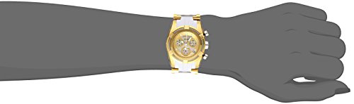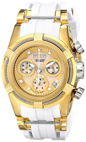 -. Feature : Chronograph functions with 60 second, 30 minute and 1/10 of a second sub dials; date window between 4:00 and 5:00; Invicta reserve 5-year warranty included with shipment / Gold mother of pearl dial with silver tone and white hands and hour markers; luminous; unidirectional 18k gold ion-plated stainless steel bezel with stainless steel wire accent; stainless steel screw-down crown; flame fusion crystal; 18k gold ion-plated stainless steel case with stainless steel wire inserts; white polyurethane strap with 18k gold ion-plated stainless steel and stainless steel wire accents / Swiss-quartz movement / Case diameter: 39mm / Water resistant to 660 feet