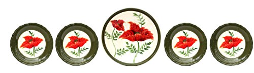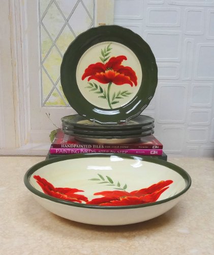 8479911 Features: -100% Hand painted. -Set includes 4 dinner plates and pasta serving bowl. -Material: Glazed ceramic. -Collection: Floral Poppy. Number of Items Included: -5. Seasonal Theme: -Yes. Season: -Spring/Summer/Fall/Winter. Dimensions: -Dinner plates: 10" W x 10" D . Overall Height - Top to Bottom: -3". Overall Width at Top - Side to Side: -13.25". Overall Depth at Top- Front to Back: -13.25".Feature
