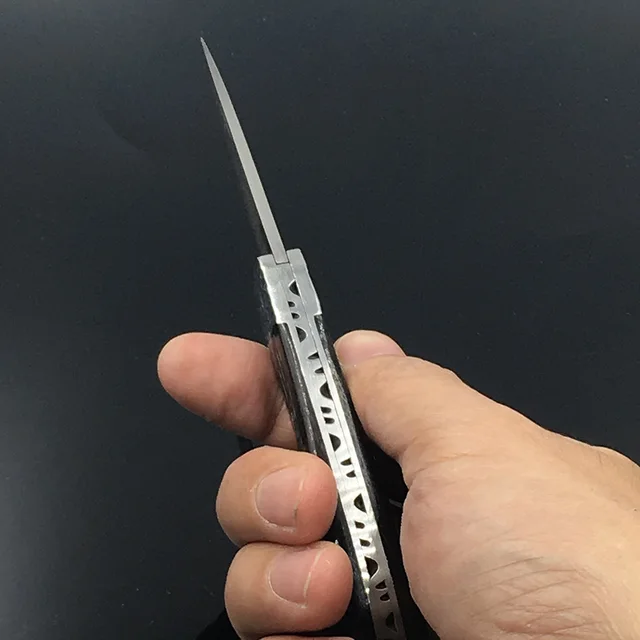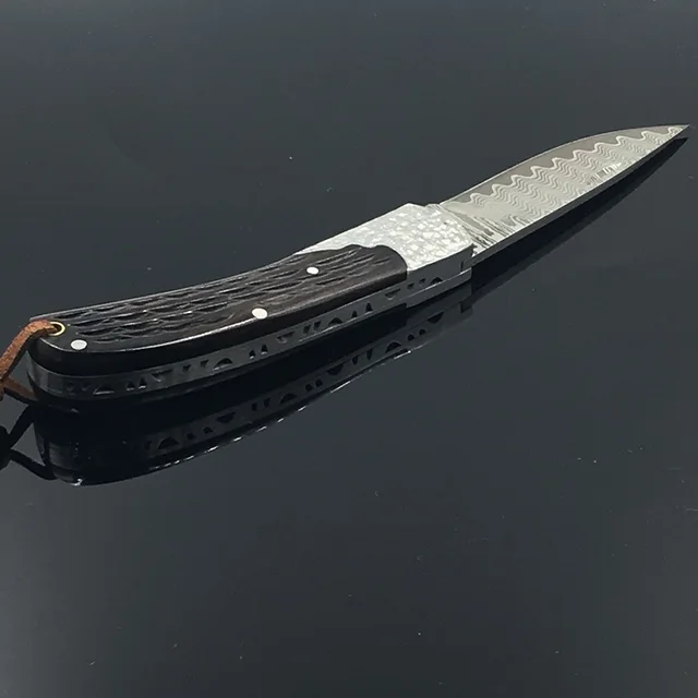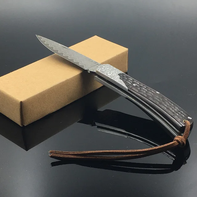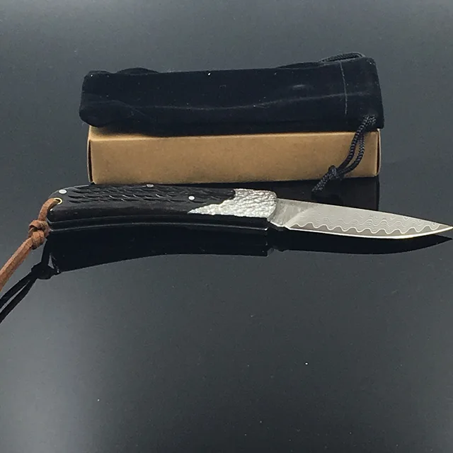 다마스커스 스틸 포켓 나이프 야외 캠핑 나이프 접는 검은 흑단 핸들 선물 칼 + 파우치