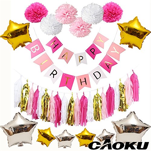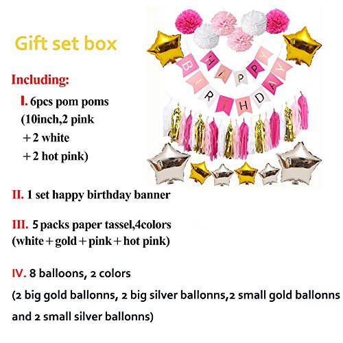 Happy Birthday Balloons,Aluminum Foil Banner Balloons for Birthday Party Decorations and Supplies With Colorful Tissue Pom Pom Ball (Pink)